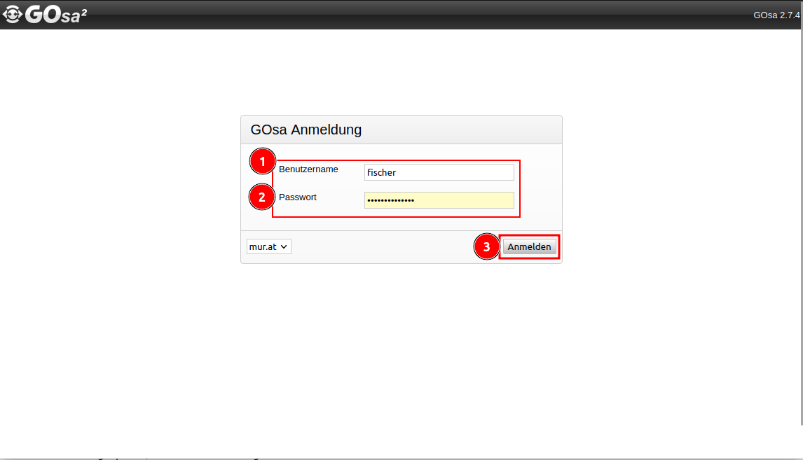 Zur Anmeldung gehe auf https://gosa.mur.at/gosa/, und gib Deinen Loginnamen (Benutzer*innennamen) sowie Dein Passwort ein. Die Anmeldung mit Deiner E-Mail-Adresse funktioniert hier nicht!