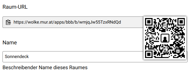 - Raum-URL: Diesen Link kannst du z.B. per Mail verschicken und andere Menschen zu der Videokonferenz einladen. Mit dem QR-Code kann der Link auch per mobilem Endgerät gescannt und auf diese Weise teilgenommen werden.