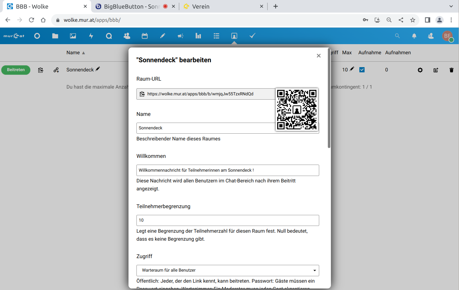 - Zugriff: Kann jeder der den Link hat auf den Raum zugreifen, gibt es einen Warteraum, od. Passwort. Intern: nur in der Wolke angemeldete mur-Mitglieder können beitreten.