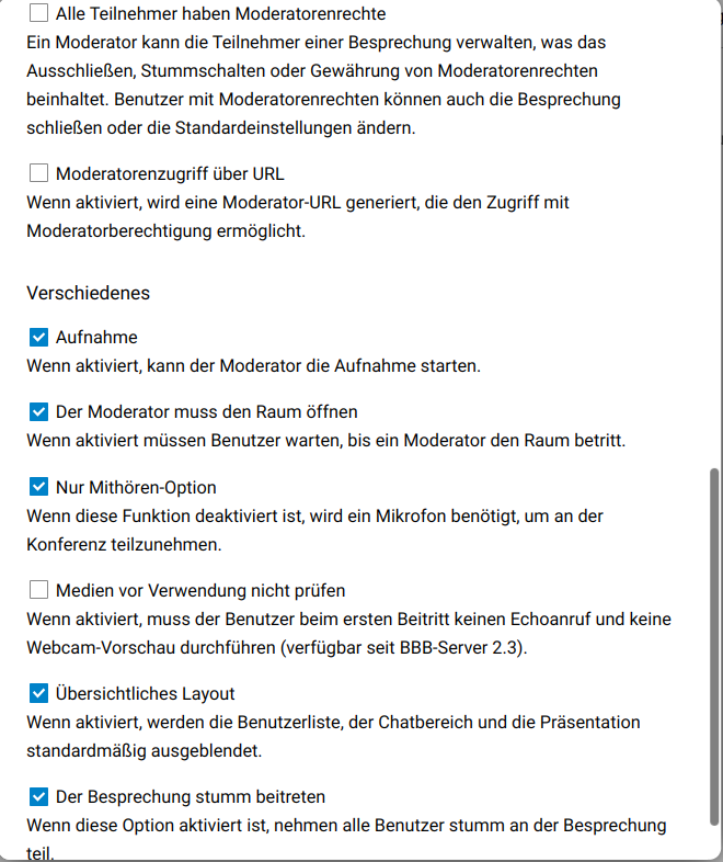 - Verschiedenes: Wenn eine Videoaufzeichnung erwünscht wird, muss die Einstellung hier vorgenommen werden. Eine Form der Höflichkeit und Respekts ist es, vor einer Aufzeichnung nachzufragen, dass diese Veranstaltung aufgezeichnet und z.B. für interne oder externe Dokumentation angefertigt wird.