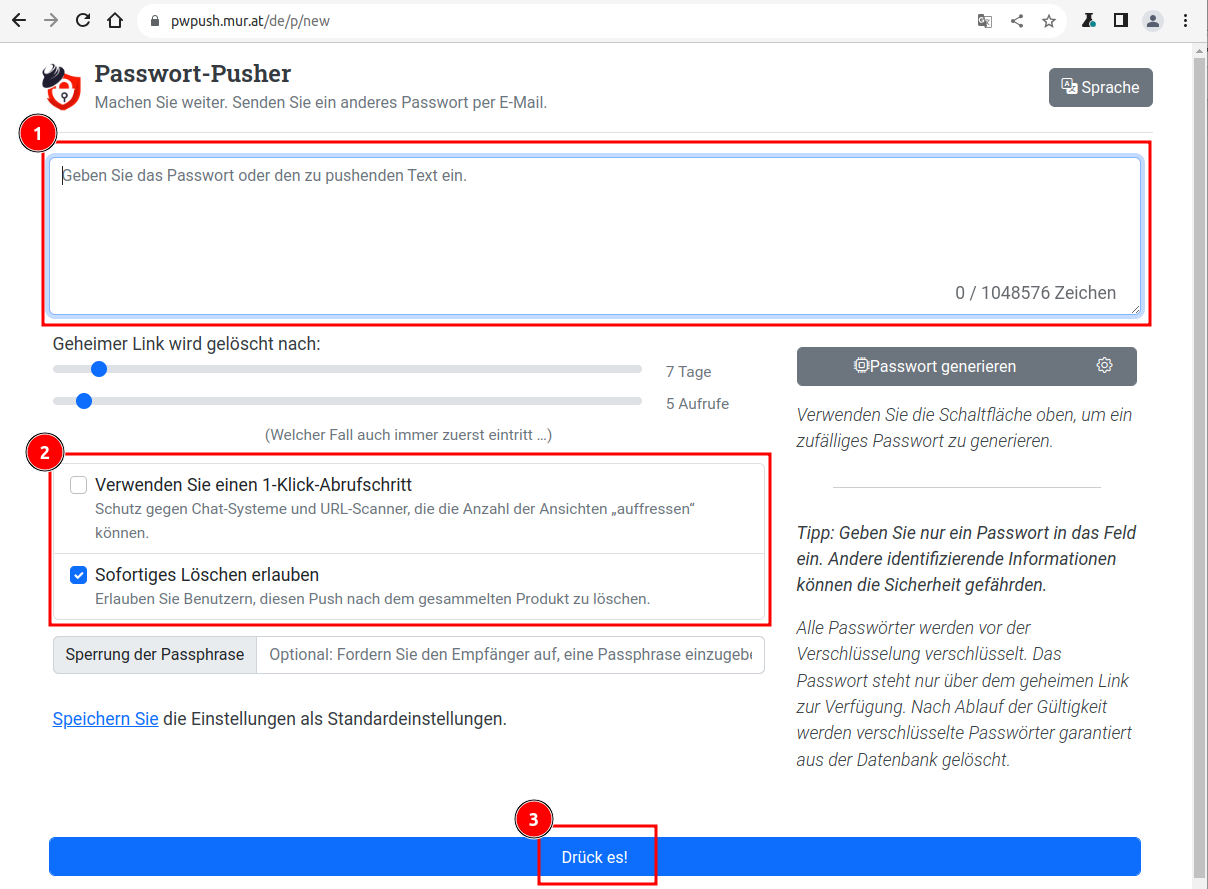 Password Pusher ist ein Tool zum sicheren Teilen von Passwörtern und anderen vertraulichen Informationen mit anderen Personen. Die Verwendung ist simpel und intuitiv auf der Seite: https://pwpush.mur.at/
