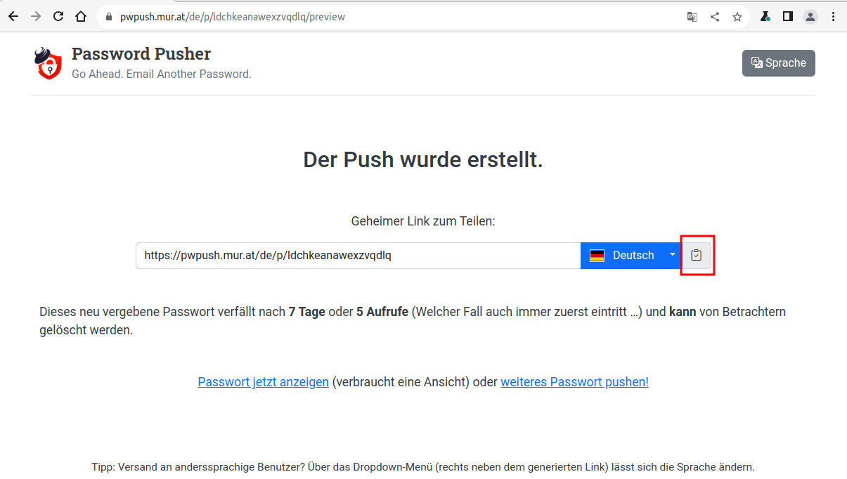 Mit dem bereitgestellten Tool 'Password Pusher' können einerseits sehr komplexe Passwörter generiert werden und andererseits für den Versand via Email and andere Personen eine eindeutige, einmalige URL erstellt werden. Dieser Link läuft nach einer bestimmten Zeit oder nach einer bestimmten Anzahl von Zugriffen ab, um sicherzustellen, dass die Informationen privat und sicher bleiben.