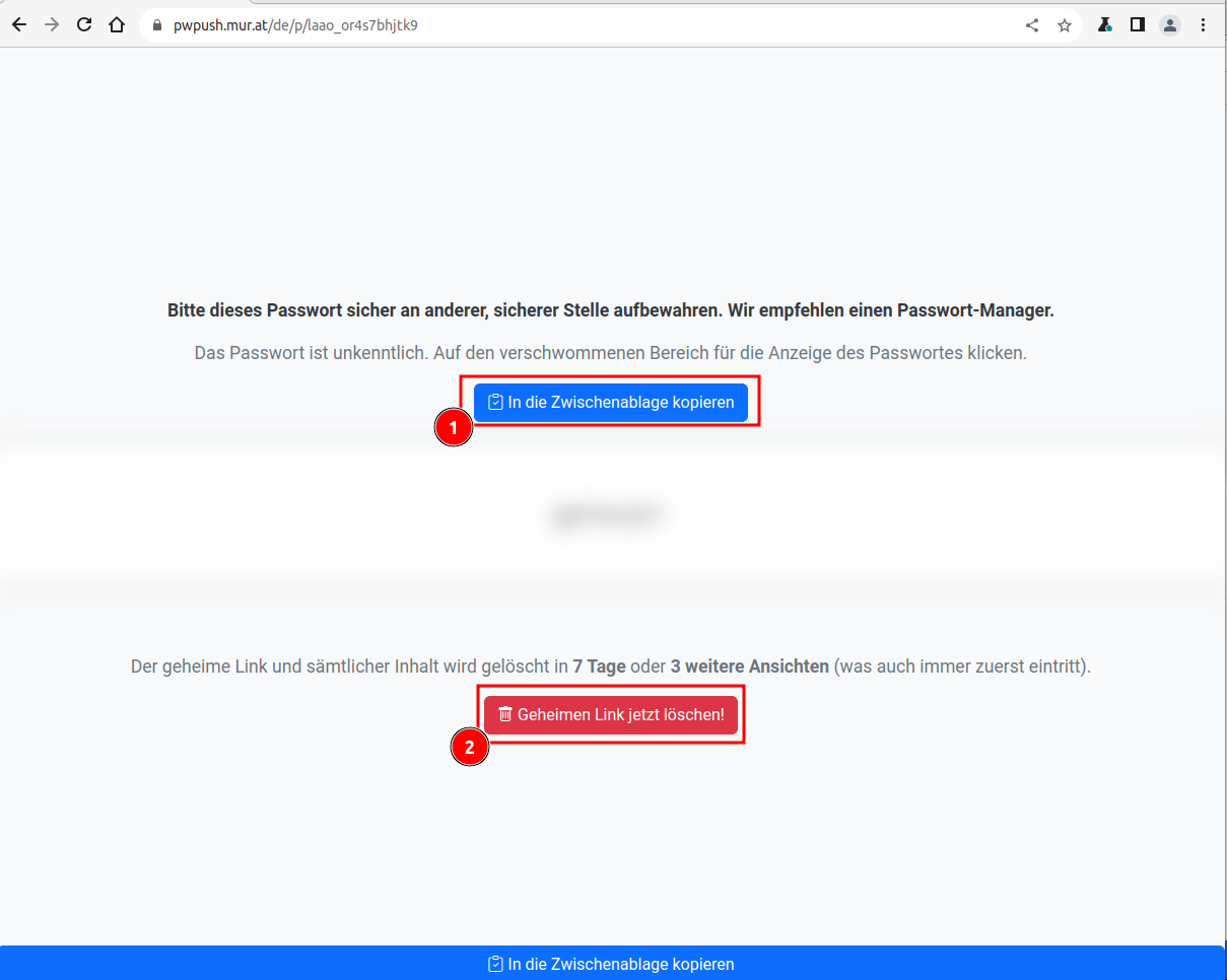 Sobald der Link geöffnet wird kann das Passwort oder vertrauliche Information eingesehen und kopiert werden.