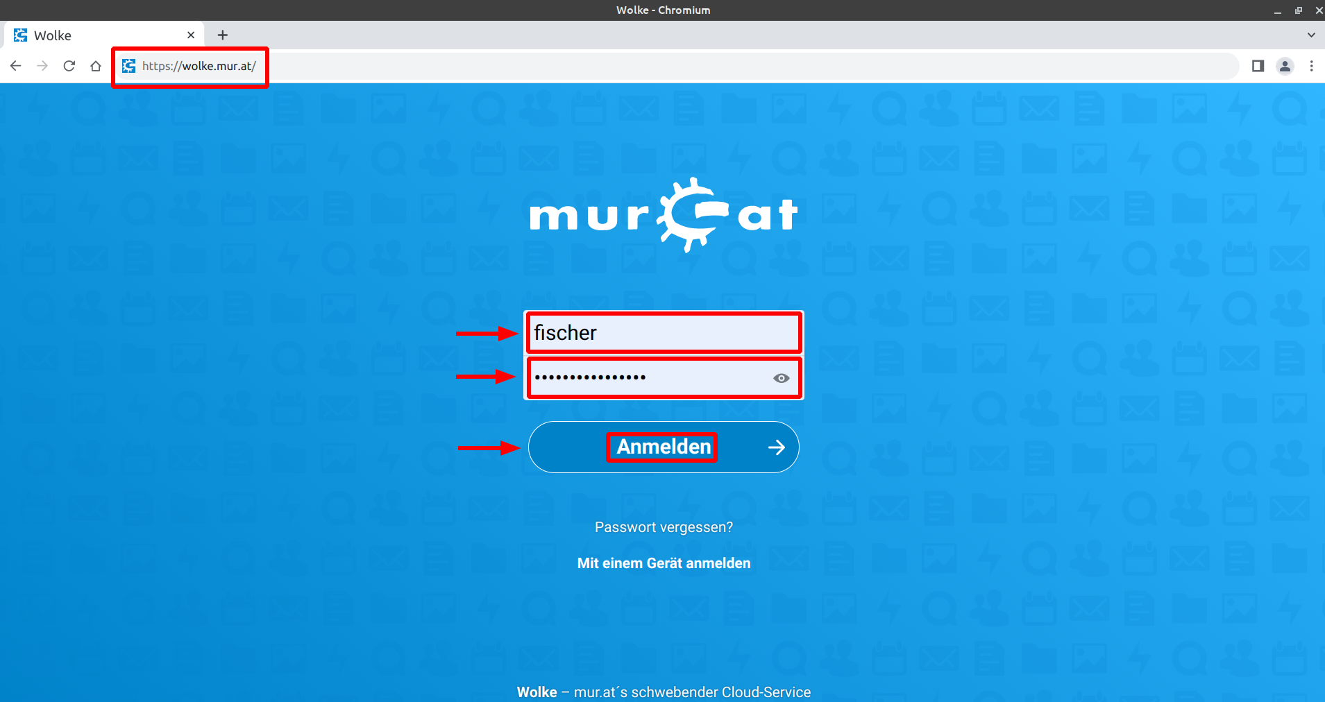 Der Web-Login passiert über die Webseite wolke.mur.at. Einfach mit deinem mur.at-Benutzernamen und deinem Passwort anmelden.
